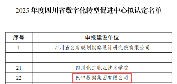 近期,根据省发改委官网公示,巴中数据集团成功入选2025年度四川省数字化转型促进中心拟认定名单,系巴中首例!标志着巴中在积极融入全省数字化转型大局、全力推进数字经济建设方面树立了巴中标杆。