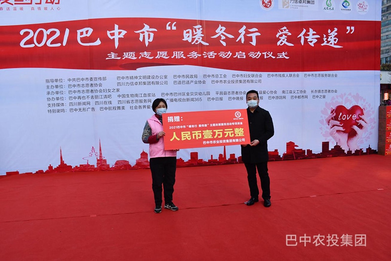 寒冬不暖人心暖!2021年2月5日,在春节来临之际,市农投集团党委副书记、副总经理胡彬代表巴中市农业投资集团及巴食巴适产业协会出席了2021年巴中市“暖冬行·爱传递”主题志愿服务活