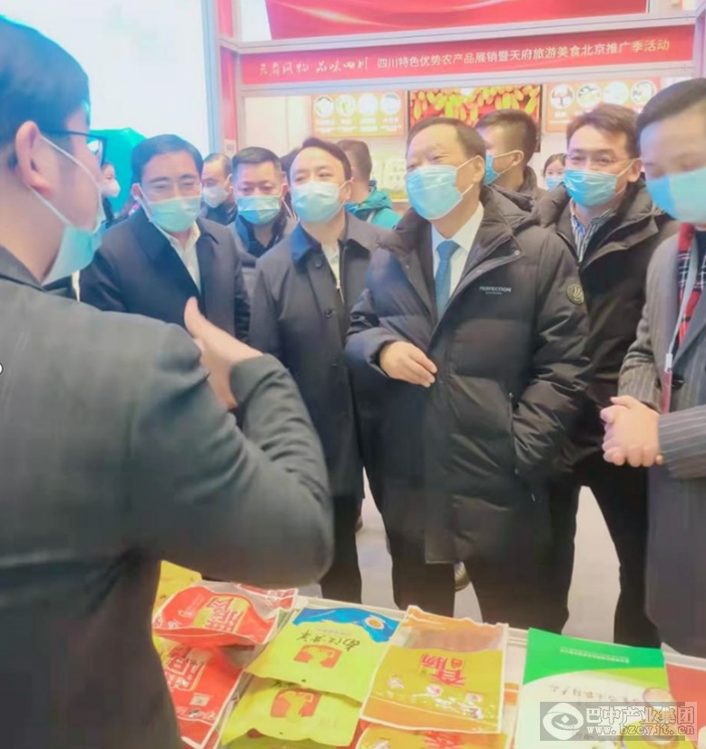 图为第十二届全国政协副主席刘晓峰、四川省常务副省长罗文等领导驻足巴中展位了解“巴食巴适”系列产品2021年12月25日,由四川省政府驻京办事处、各市(州)驻京机构联合主办的“天