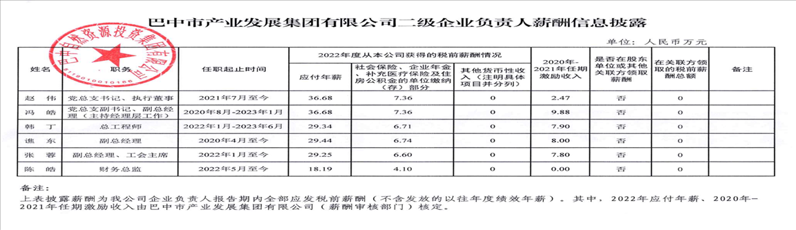 巴中市产业发展集团有限公司二级企业负责人2022年度薪酬信息披露表