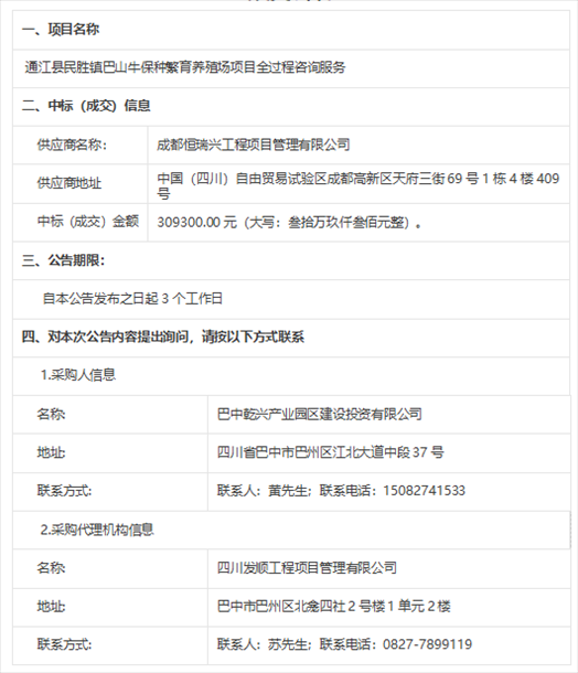 通江县民胜镇巴山牛保种繁育养殖场项目全过程咨询服务成交公告