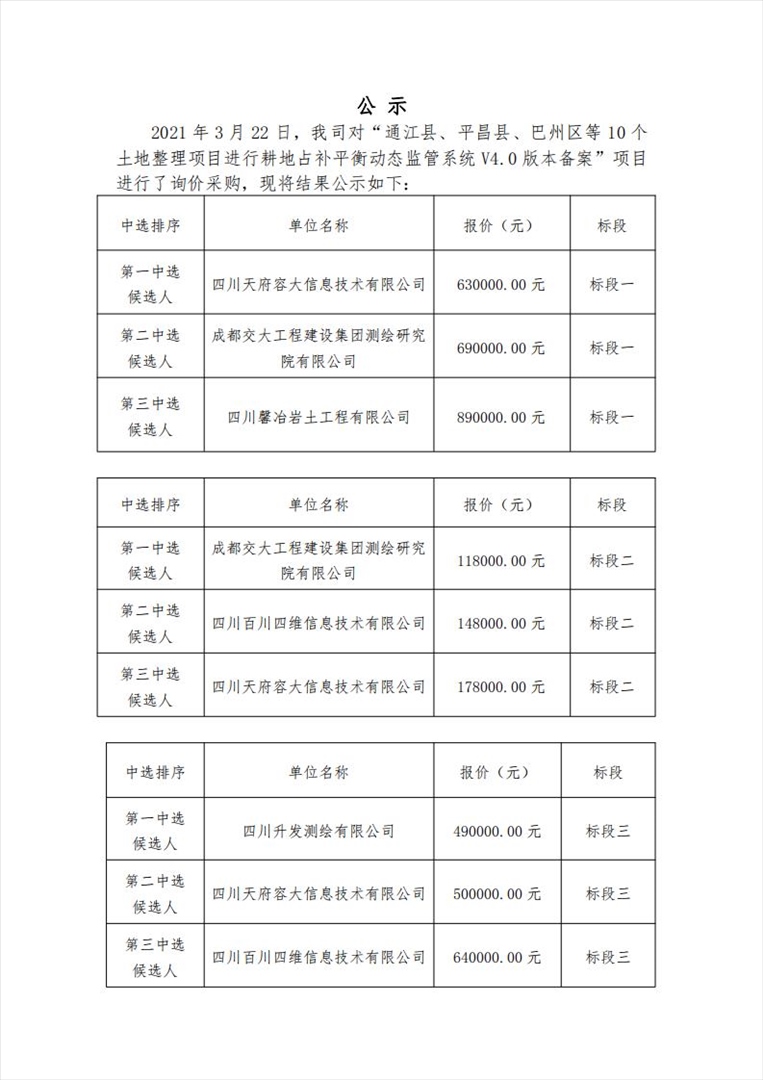 询价采购结果公示(通江县、平昌县、巴州区等10个土地整理项目进行耕地占补平衡动态监管系统V4.0版本备案)