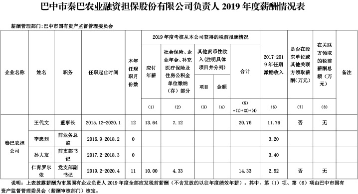 巴中市秦巴农业融资担保股份有限公司2019年负责人薪酬公示表